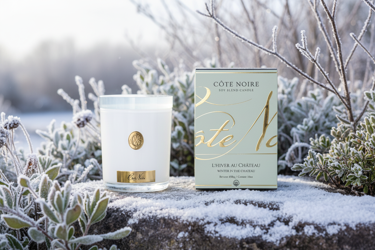 NEW Cote Noire Soy 185g Candle - White Vessel with Gold Badge - Winter in the Chateau - CWG18553